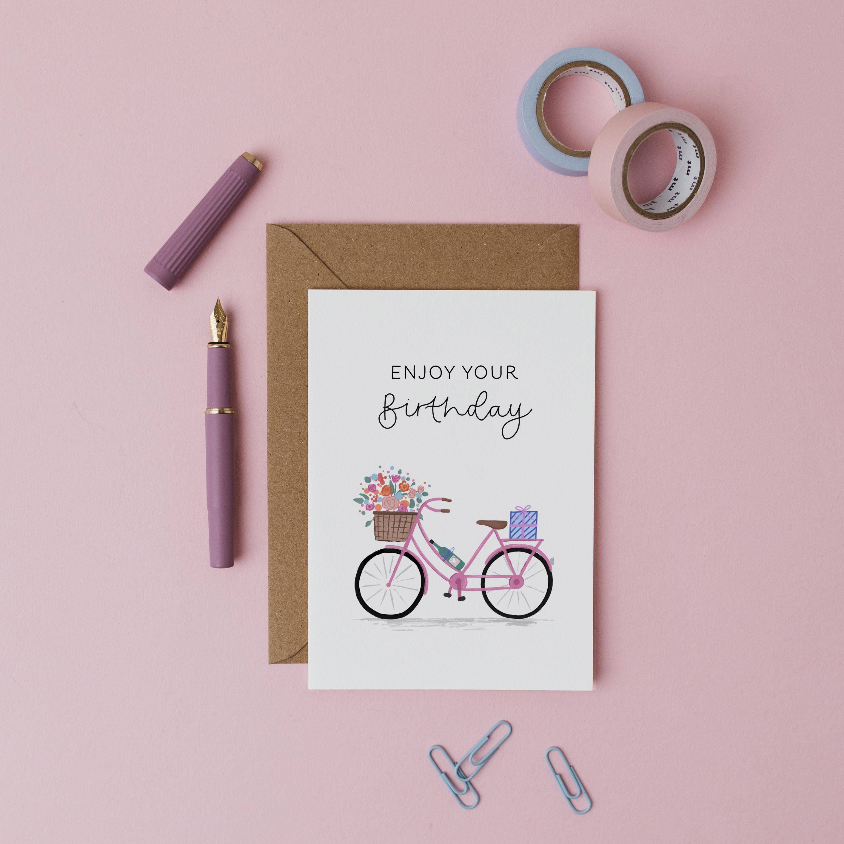Birthday Bike Card Digitally printed onto 350 gsm GF smith paper and comes with a recycled brown envelope Blank inside for your own message A6 in size when folded. Designed & made in the UK