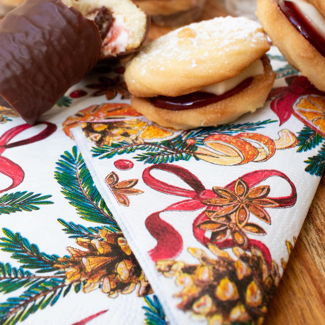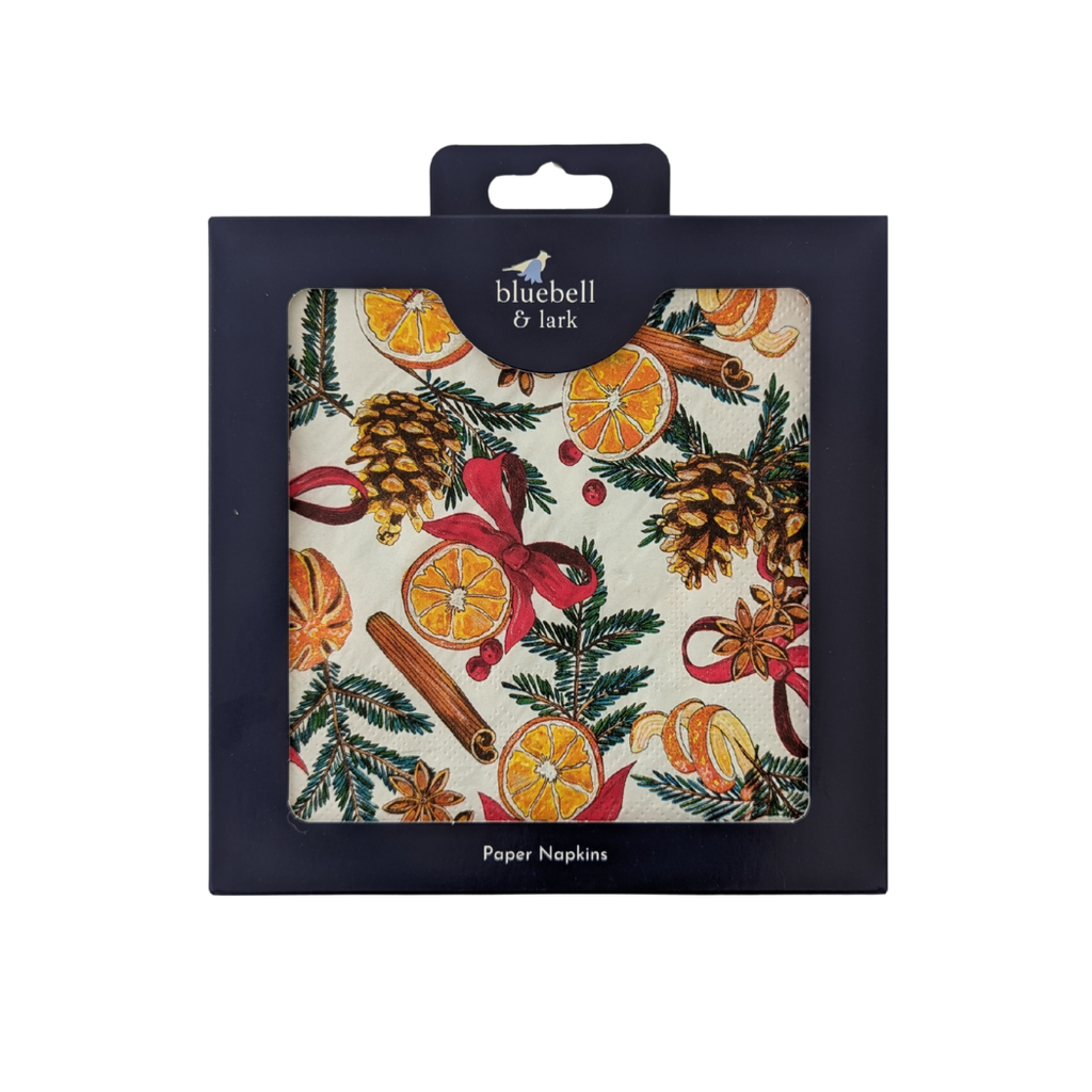 Warm and wonderfully festive, our Orange and Cinnamon on Cream paper napkins feature a repeat pattern of hand-illustrated orange slices and cinnamon sticks by UK-based independent artist Bibi King-Harman. Each pack contains 20 napkins, plus one additional napkin at the front to replace a plastic cover — a completely plastic-free product. Packaged in a classic navy cardboard box, they’re perfect for retail display or adding a seasonal touch to your table. Size: 33cm x 33cm when unfolded Material: High-quality 3-ply paper Packaging: Navy cardboard box, no plastic Quantity: 20 napkins + 1 front display napkin Designed in the UK by independent artists Part of the Bluebell and Lark collection – celebrating the sights and scents of the festive season through beautiful British design.