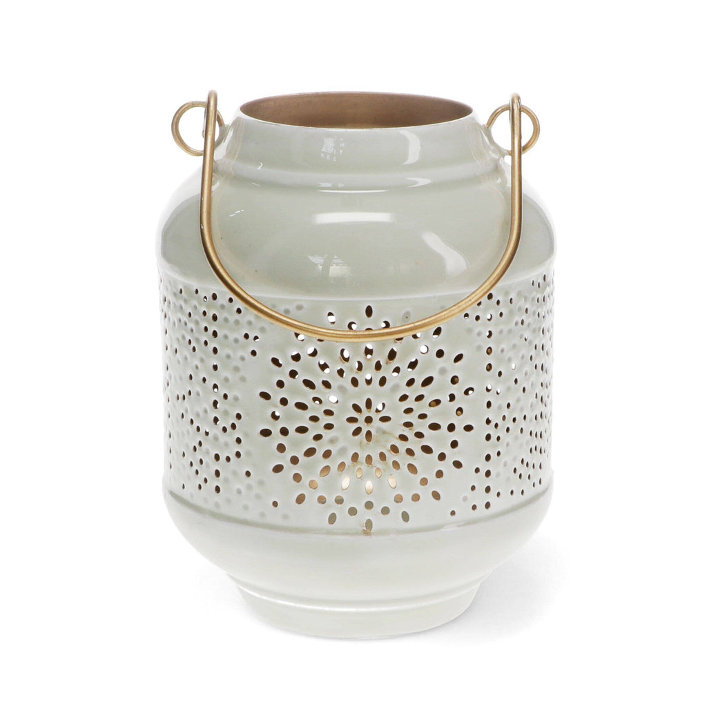 Decorative cast metal lantern for tealights, with light grey enamel finish on the exterior, brass-coloured interior and brass-coloured handle/hanging loop. Can be hung up or placed on a surface in the home or garden. The beautiful perforated pattern will illuminate the space with stunning patterns of light.