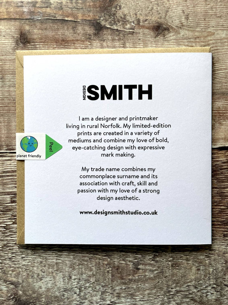 All my cards are from my own quirky and original illustrations and are blank inside, so they work equally well as greetings cards or notecards. They are square (15 x 15cm) cards printed on high quality matt, 350gsm card stock. They come with a kraft envelope and are sealed with a card clasp.
